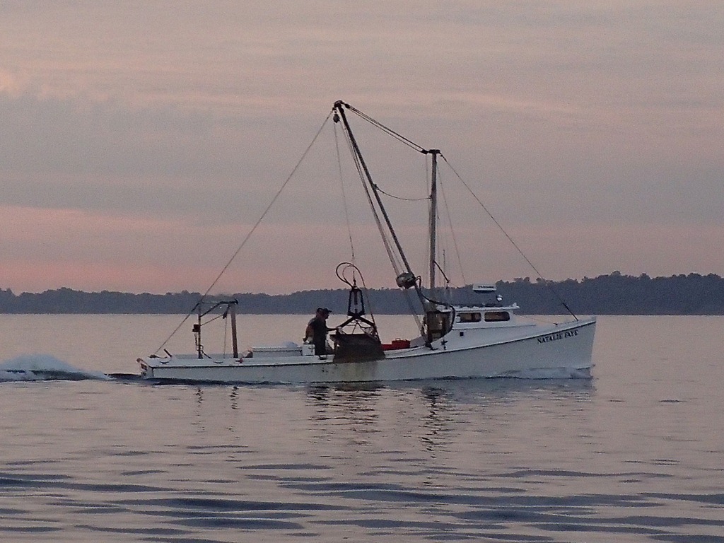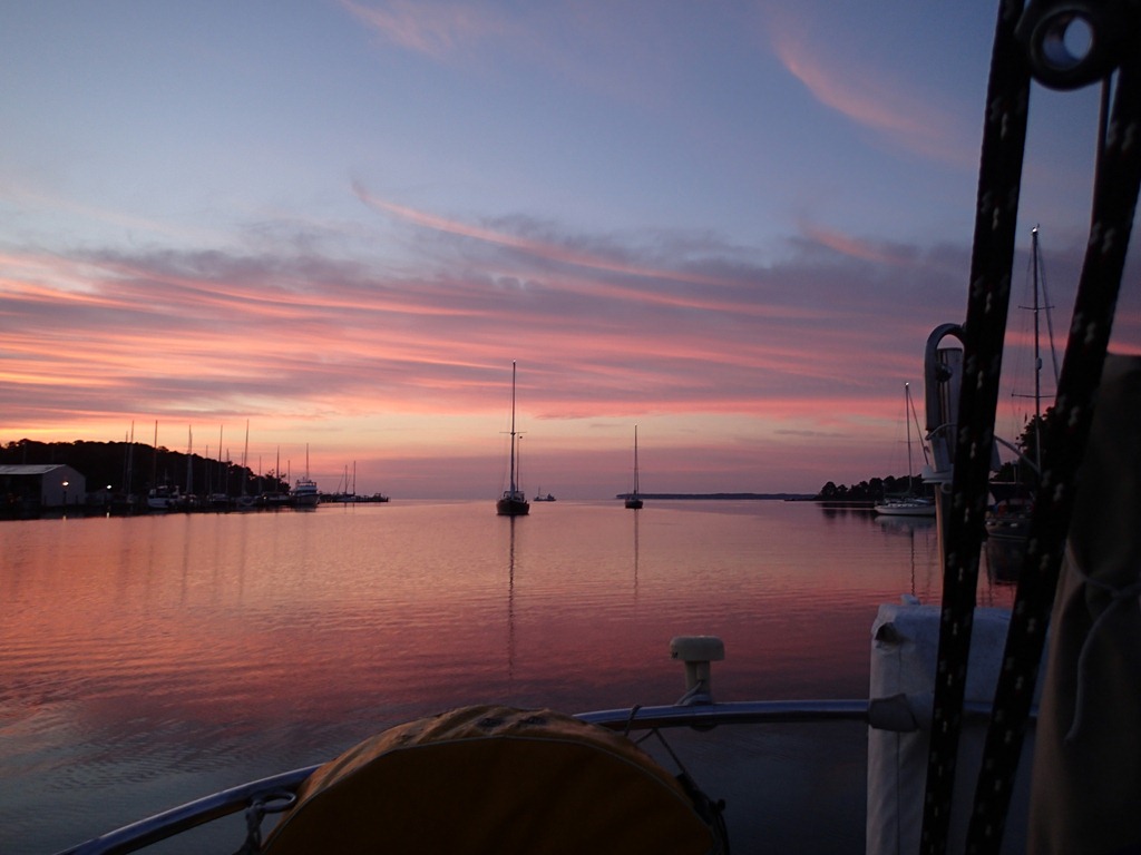 We left Solomons Island early Wednesday and motored, briefly sailed, motored-sailed, and motored to Deltaville, VA, a very pretty and comfortable anchorage. Each day we are up with the sun. This is Solomons at sunrise: