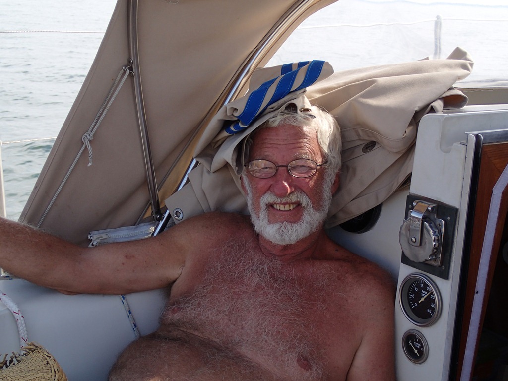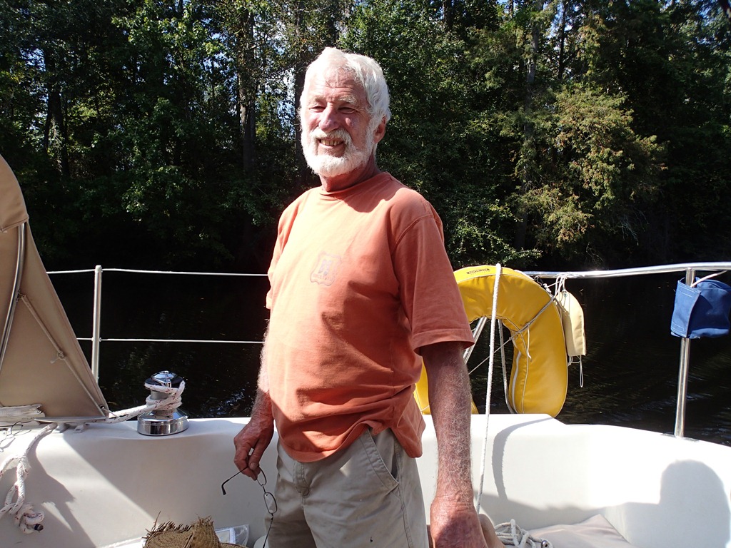 Since we had no wind, we motored down the Bay. One of us is always steering. Goldwin typically has many boat projects to keep him busy, but sometimes he relaxes. Here he is, “wearing” the tiller cover as a hat:
