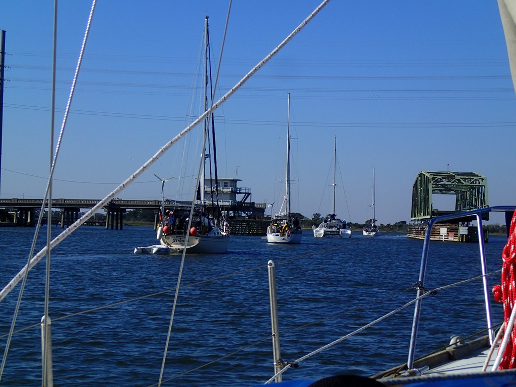 Bridges that don’t open “on demand” have scheduled openings.  Here are half a dozen boats all bunched up at the Surf City Bridge which only opens once an hour, on the hour.  We mill around waiting for the opening, fighting wind and current and trying not to run into each other or the bridge.  Lots of anxiety.  And for this bridge, the 2nd boat in front of us slowed to almost a stop right in the middle of the bridge; the boats behind – including us – had to do some hard, quick reverse not to hit him.  Yikes.