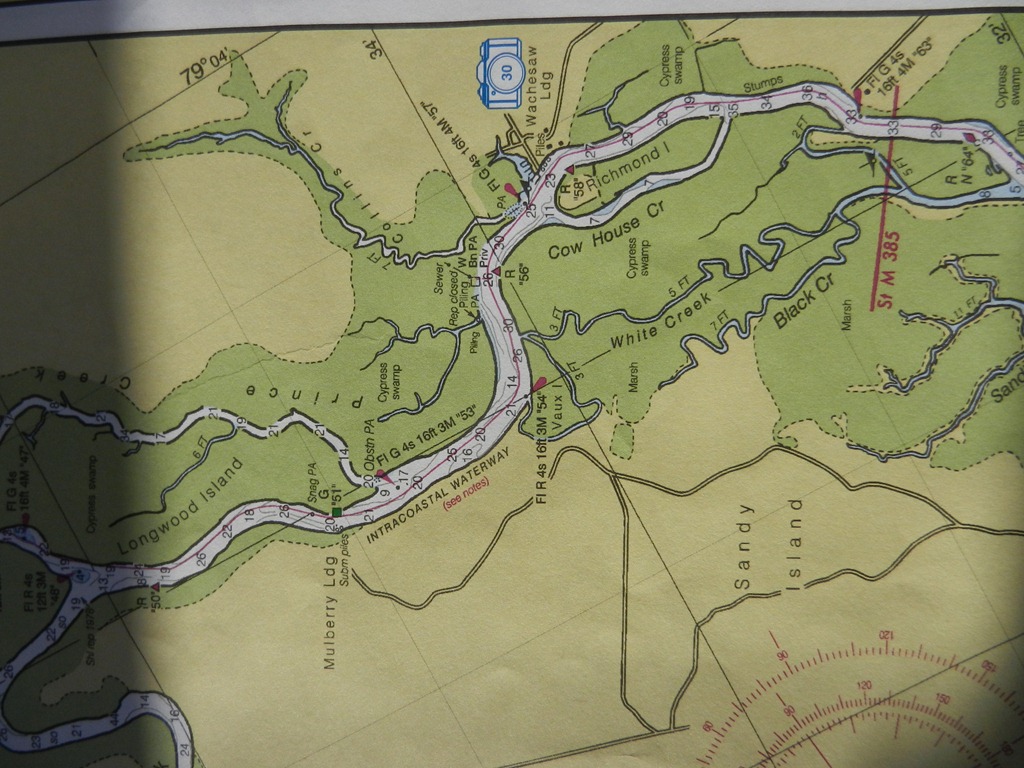 We also have to depend on each other and trust each other – like at home, but different.  And it’s also fine to be a check for each other, diplomatically of course and without appearing to doubt the other.  For example, “do you want me to steer now,” means “you are in 5’ of water, are you trying to run us aground, you must be too tired/distracted/spacey to steer right now, OMG, let me steer.”  Or, as we are coming into a dock, “you have enough speed” means “slow down RIGHT NOW or we’ll crash into the dock.”  Like that.  I think every couple has their own code.  But we both help with piloting, following the chart and watching for marks and buoys.  Just yesterday, I missed a turn and got out of the channel – thankfully I didn’t run us aground.  This is what our chart looks like for the cypress swamp of the Waccamaw River.