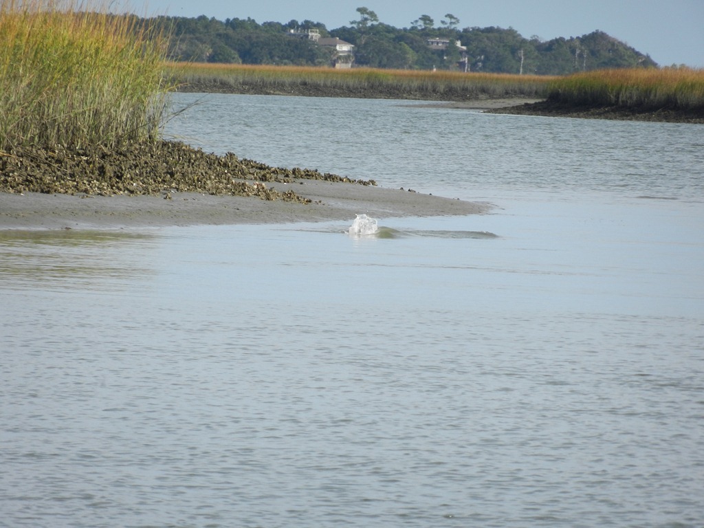This anchorage is just northeast of Charleston.  You leave the Intercoastal Waterway and make your way through what are basically swampgrasses with little rivers through them.  We watched dolphins play in groups of two and three, feeding along the shore and chasing our boat.  Here’s what the swampgrasses look like at low tide and you can see the splashing of a dolphin near the shore.