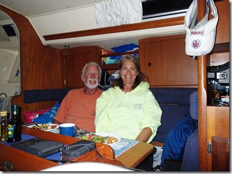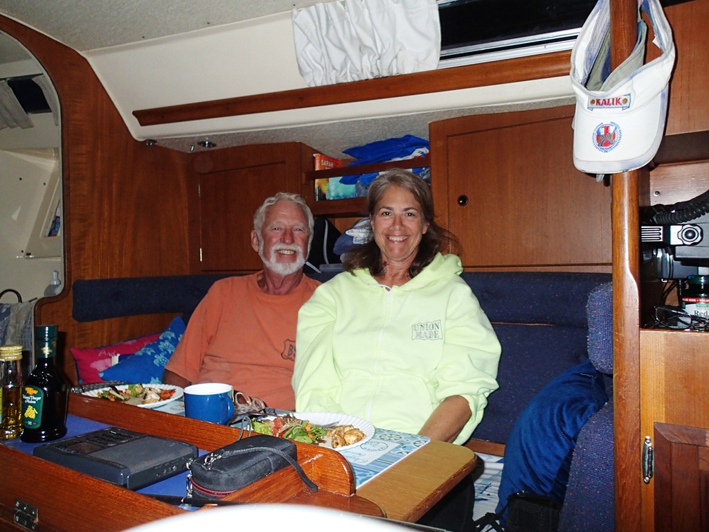 Part of the lifestyle change is that my husband of 31 years and I are with each other 24/7 on a boat 31’ long and 10’ wide. That’s some togetherness.  I used to see him for about 2 minutes in the morning – just long enough for him to tell me how great I looked – he always did no matter how horrible I really looked.  And then for about 2 hours at the end of the day, scrambling to get dinner and eat.  So this is very different.  Here we are having dinner on the boat – very relaxed.