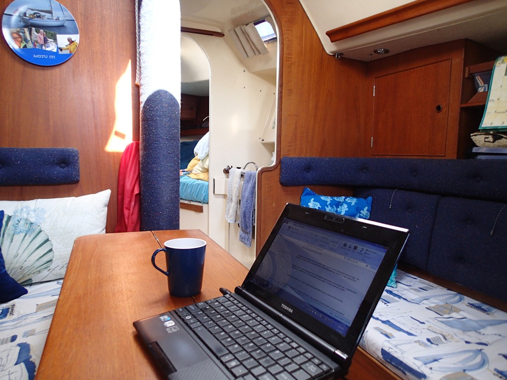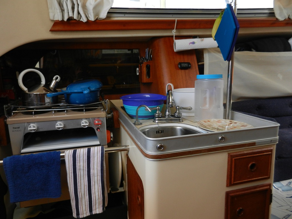 The galley is petite, and I say that affectionately but critically.  Working in such a small space took some getting used to.  If you don’t cook much, or don’t cook from scratch, or don’t bake, it’s great.  But I do all of those things.  I definitely don’t want to have to power a wafflemaker, expressomaker, microwave, blender, bread machine, food processor or toaster – but a bit more counter space would be great.   (BTW, all of the above are on larger boats here.)