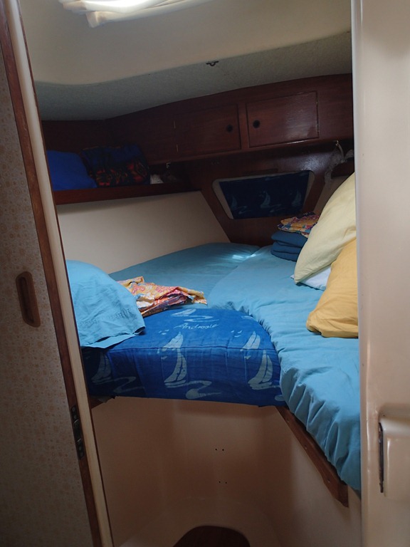 The bunks in the v-berth area surprisingly comfortable, plus there is some standing room and a bit of storage.