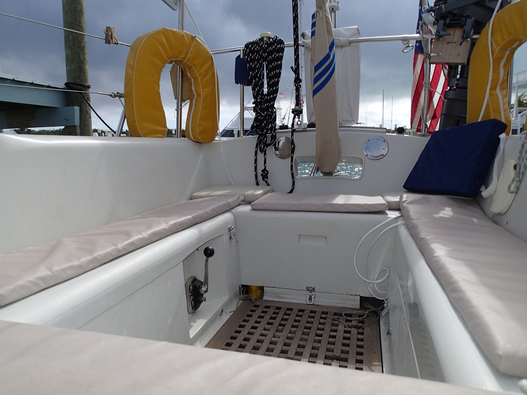 The Nicholson also has a tiller, outboard rudder, and full keel, which my husband favors. The tiller, which stows upright, gives us more useable cockpit space than many larger boats whose cockpits are overwhelmed by their massive wheels.