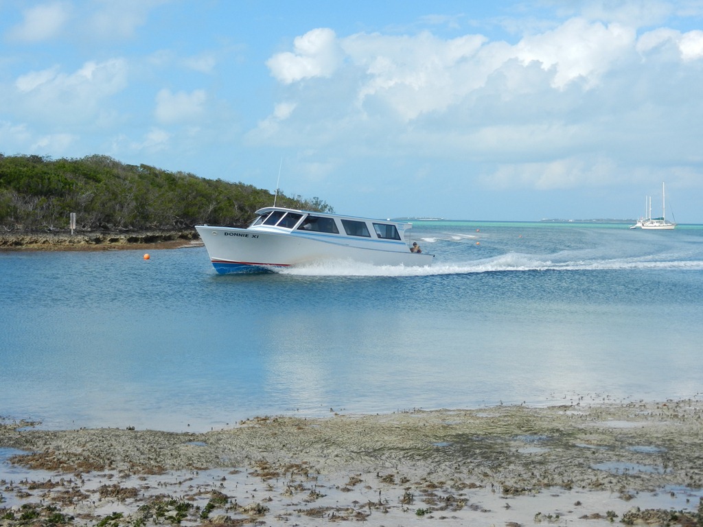 Albury’s ferry boat (Donnie II, III, IV, etc.), comes from Marsh Harbor, the nearest large city (referred to as “on the mainland” even though it’s really on Great Abaco Island), several times a day, delivering locals to their jobs, bringing students home from school, and transporting tourists with their luggage.  Although Hopetown harbor is not that big, the ferry often makes 5-6 stops at the various docks.  Their captains are primo boat handlers.  A barge brings in food, materials and other supplies.