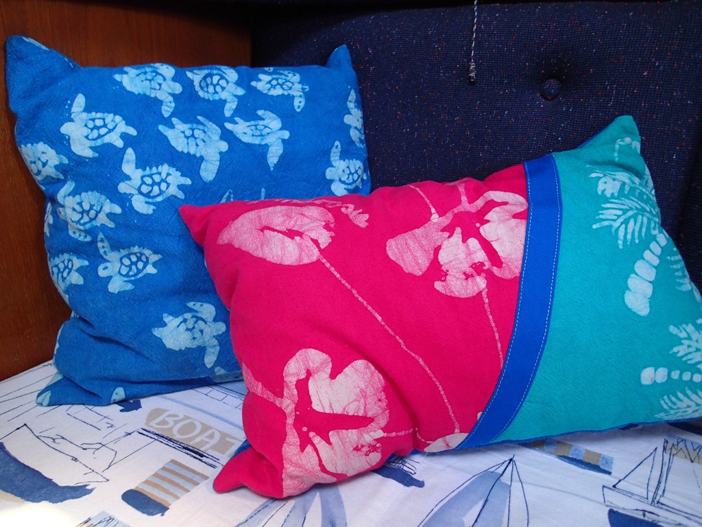 I also made accent pillows.  This is Androsia batik fabric which is made here in the Bahamas on the island of Andros.  The gorgeous, bright colors are just plain fun.  And they make the main cabin seating extra comfortable.