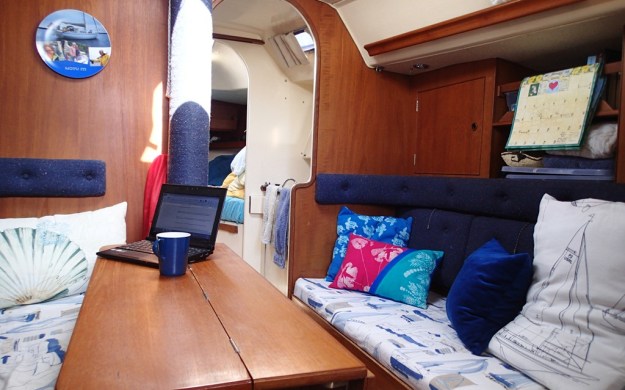 Don’t think of it as “interior décor,”  which is unseemly for manly, salty sailors.  Think about it as liking what you see when you go below in your boat.  And keep in mind that every boat already has some sort of interior décor.  An older, used boat, (which is what we’ve always had), is probably going to have upholstery from the 1970’s or 1980’s – and not in a good way.  It will be bland and boring, gross and disgusting, weirdly retro and hopelessly ugly, or all of the above.  If it’s old enough, like our 1957 Rhodes Bounty, it’s vintage and classic.  But those in between years were pretty awful.  And you have to be sure that what’s on the boat will survive the trip.  All parts of a boat really take a beating from cruising.  Face it, boats are made to be sailed a few times a year, not lived in 24/7.