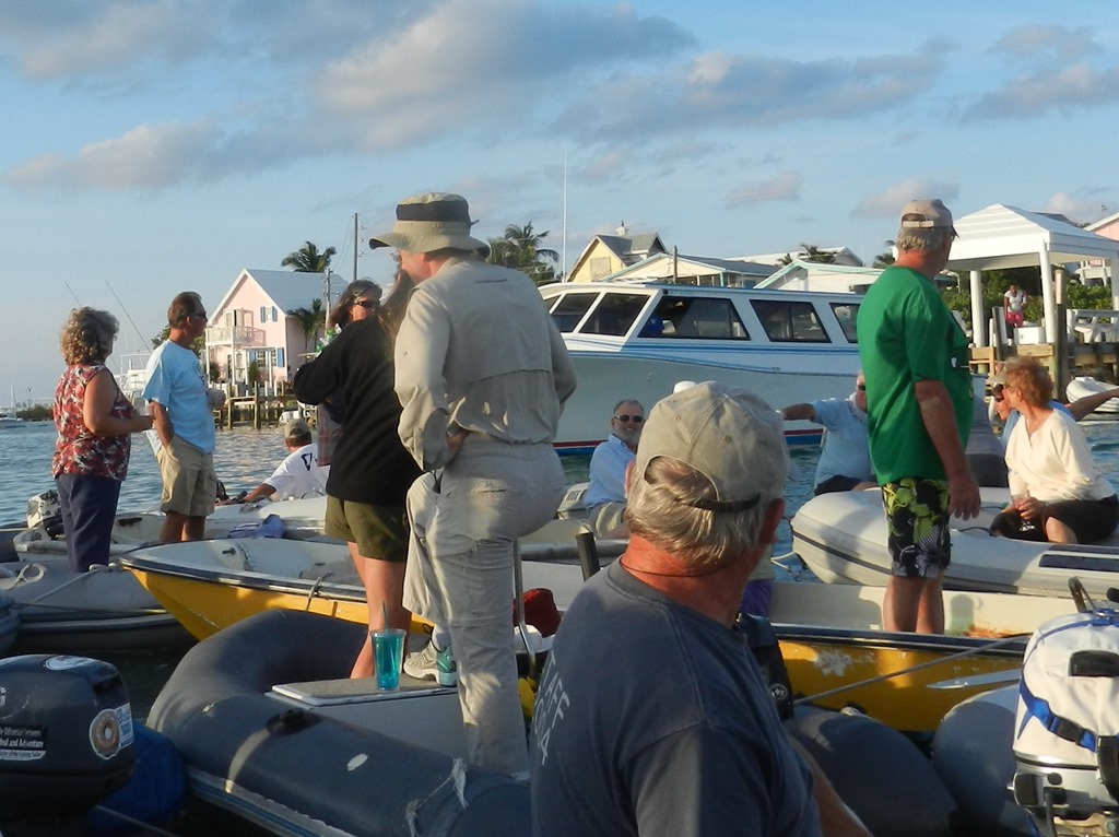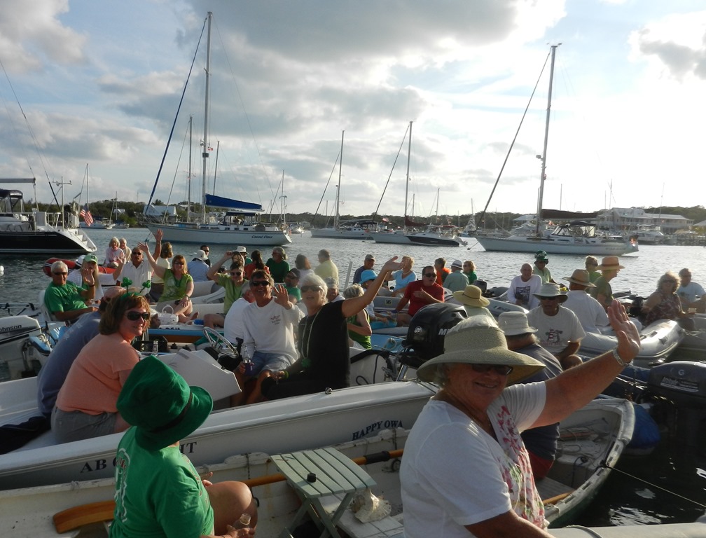On St. Patrick’s Day in Hopetown Harbor, the cruisers get together for a raft-up, a/k/a dinghy drift, just before sunset. Dinghies converge at a pre-determined location – off the Post Office Dock – and tie themselves together. It’s a floating island.