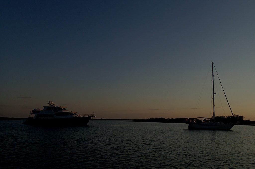Usually when someone anchors on top of you (which is what he did to “Affaire”), you walk up to the bow of your boat and glare at them until they take the hint and move. We were all waiting for a response from “Affaire” – French Canadian boats have a reputation on the Waterway and it’s not for subtlety. We were not disappointed. “The sailboat “Showtime” in front of me,” a very loud disembodied voice with a heavy French accent called out across the anchorage on an impressive PA system. “Mon ami, if you would please to come over to my boat, I will tell you where you can stick your anchor.”
