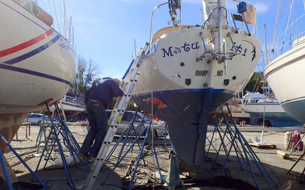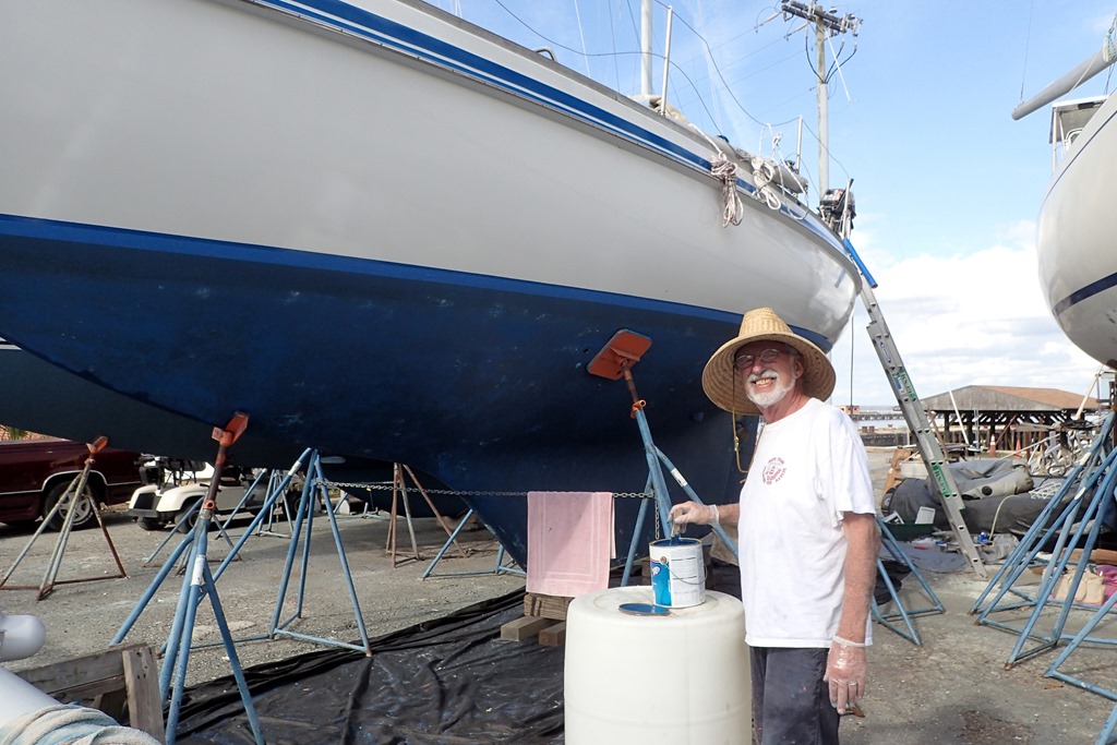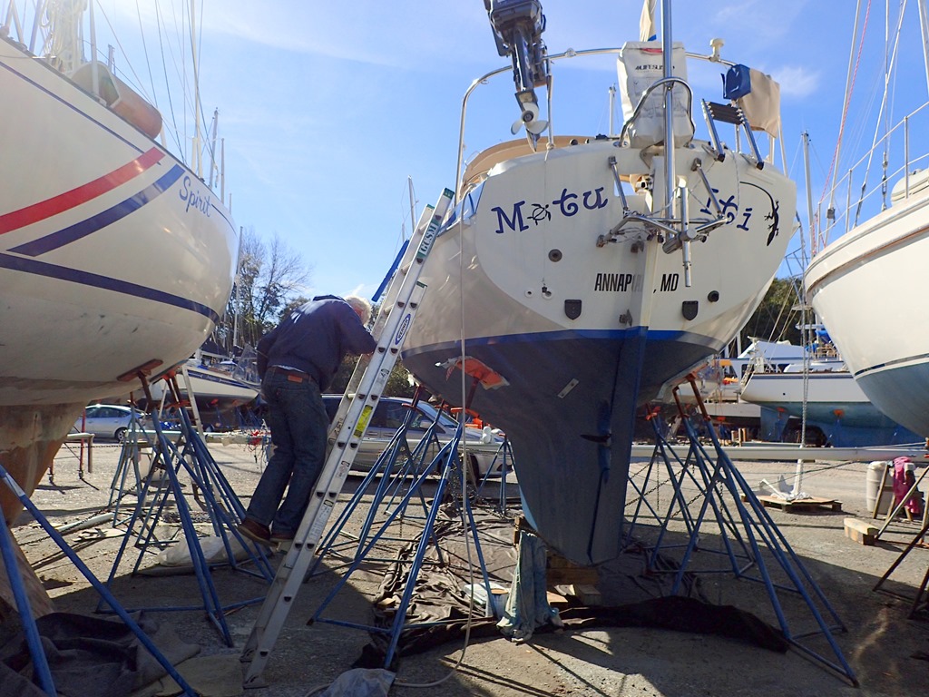 We joined her after Christmas, via rental car.  On the way we enjoyed the holidays with our family in Norfolk and with good friends in South Carolina.  We are now living on Motu Iti on the hard.  Which means we access our “home” by ladder. Not my favorite way to be on the boat.