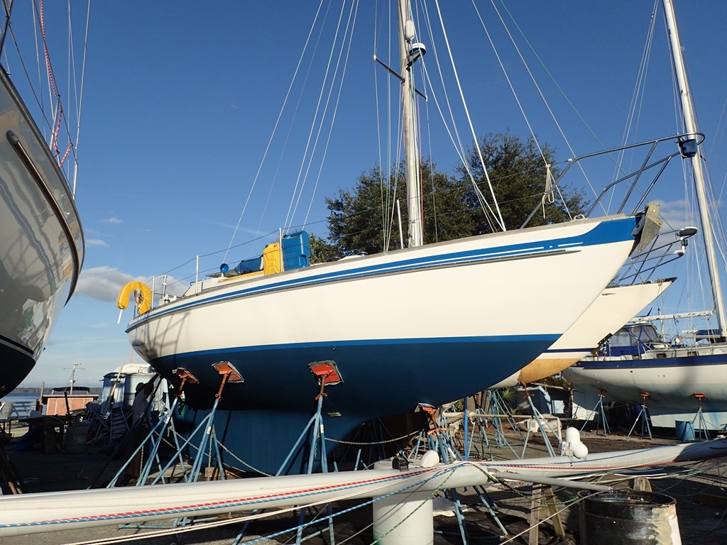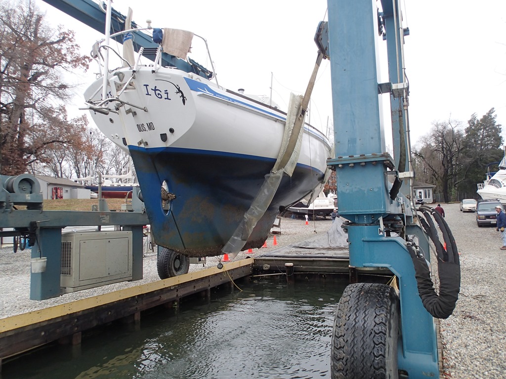 You can see the mast along the front of the boat – Goldwin spent a whole day cleaning it and getting it ready for our launch.  But we were delayed – we couldn’t launch in early January because the marina didn’t want to step the mast with the high winds we were having – too tricky and dangerous.