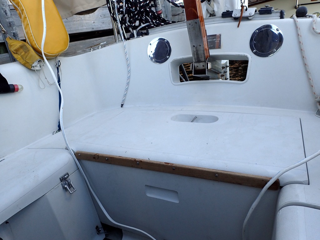 Its dimensions are 10.5”x16”x21”. The size is critical because this particular liferaft, when properly packed, fits perfectly (just barely) into our aft lazarette, i.e., storage locker. And it fit – yeah! It didn’t quite fit before it was re-packed.