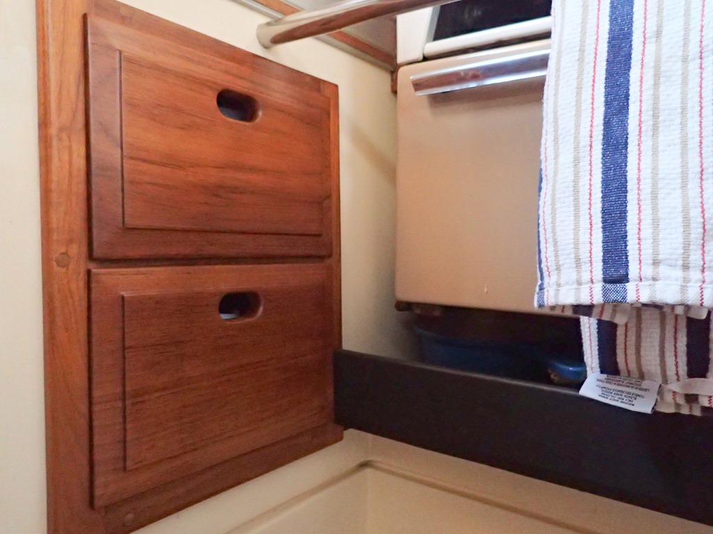They were installed in the area of the original fridge – that never worked and lacked any insulation. Now they hold the utensils that I used to keep in an aft locker of the main salon, all jumbled up in a big plastic basket.