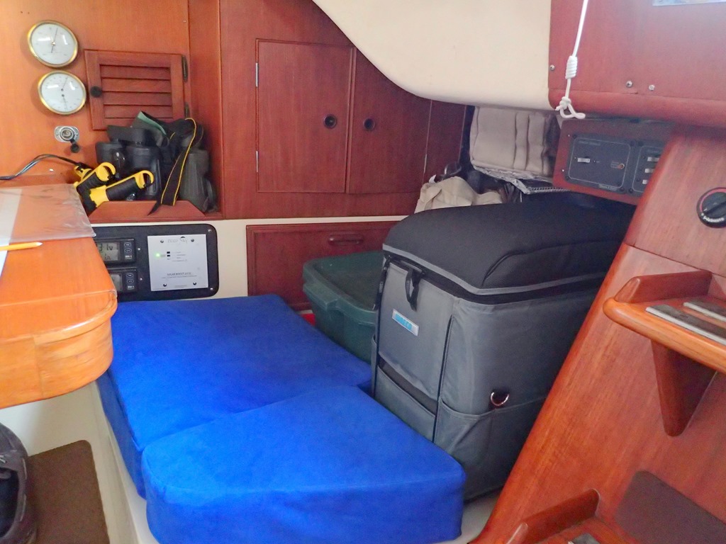 This improvement puts the fridge on a flat surface and up at almost counter height. I re-did the cushion. It’s now a seat cushion, not an entire berth cushion, so Goldwin’s tools fit more easily in the space that was the quarter berth. The new cushion is really two cushions joined by velcro. I pull off the little cushion and lift it out so I can pull the fridge out for easy access. So much better.