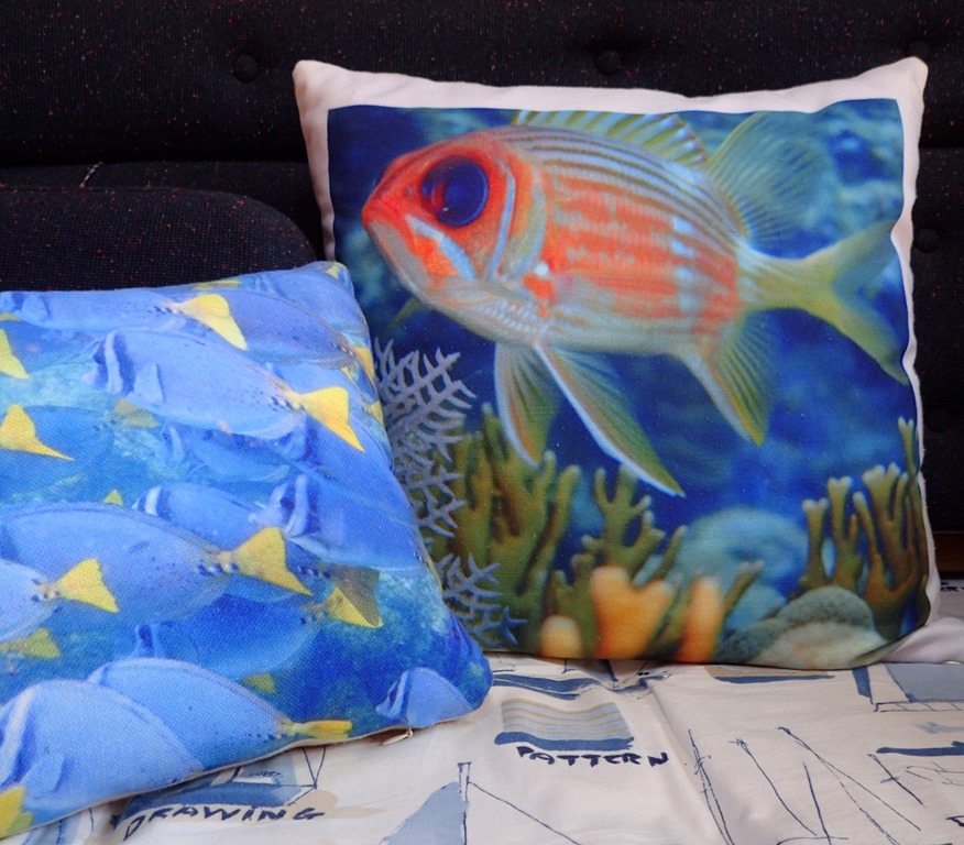 And we have new pillows, made from our photos. Here are my favorite fish pictures – the one of the big-eyed orange guy was taken at Thunderball cave in the Exumas – and my yellow-tail fish are from a snorkeling trip in the Galapagos.