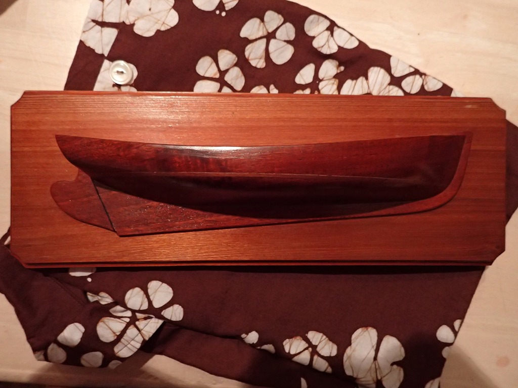 Goldwin also bought a beautiful half-model of an Abaco dinghy from one of the Albury boat builders. The fabric in the background is called Androsia fabric – it comes in beautiful prints which are all created here in the Bahamas on Andros Island.