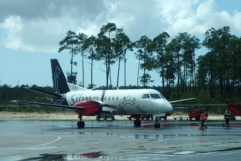Finally, at 1:14 p.m., an actual Silver Airways plane from PBI landed at the Marsh Harbor airport. And I, of little faith, had seriously doubted whether SA even had any planes. Its scheduled arrival time was 11:10 a.m. – it was two hours late. But why was it parked way over there instead of near the terminal?