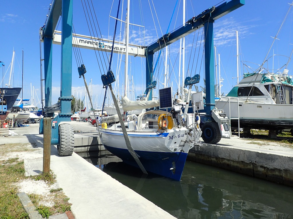 By the time we found Terminal 1, there were only six of us left to be transported to PBI. The others, a family of four, had befriended a family from West Palm during their stay in Abaco and were going to spend the night with them. I was on the phone with our daughter who was searching for hotels – all booked or quite expensive. On the drive north, I finally connected with a car service that could pick us up at the airport when we got there. A Cadillac SUV took us to the boat, arriving just after midnight – so exhausted we were practically incoherent. Luckily the ladder was still next to the boat.
