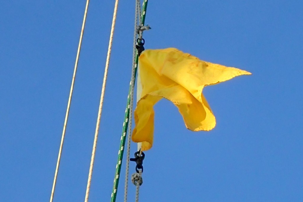 Up went the yellow quarantine flag; last trip we didn’t have a yellow flag and had to use a t-shirt.