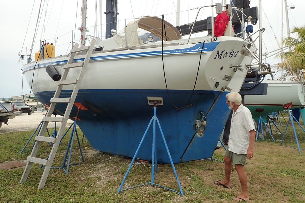 There, Motu Iti will spend the summer and early fall on the hard. We’d investigated other options. We felt that a slip at a marina would not protect her as much as being on a mooring – where she can move without running into pilings. We talked to those who care for boats over the summer at Man O’ War’s eastern harbor and in Hopetown. We were worried about her surviving a hurricane at a mooring, so we passed. We also knew that her bottom would like being on the hard, i.e., not growing streamers or collecting barnacles. A boat yard in Green Turtle Cay is very protected, but has a waiting list. So we toured the Marsh Harbor Boat Yard. It’s low and very open to the east, but it monitors the boats, does monthly boat checks and, in addition to stanchions, builds a wooden cradle for the boat and straps her down to tie-downs anchored in cement.