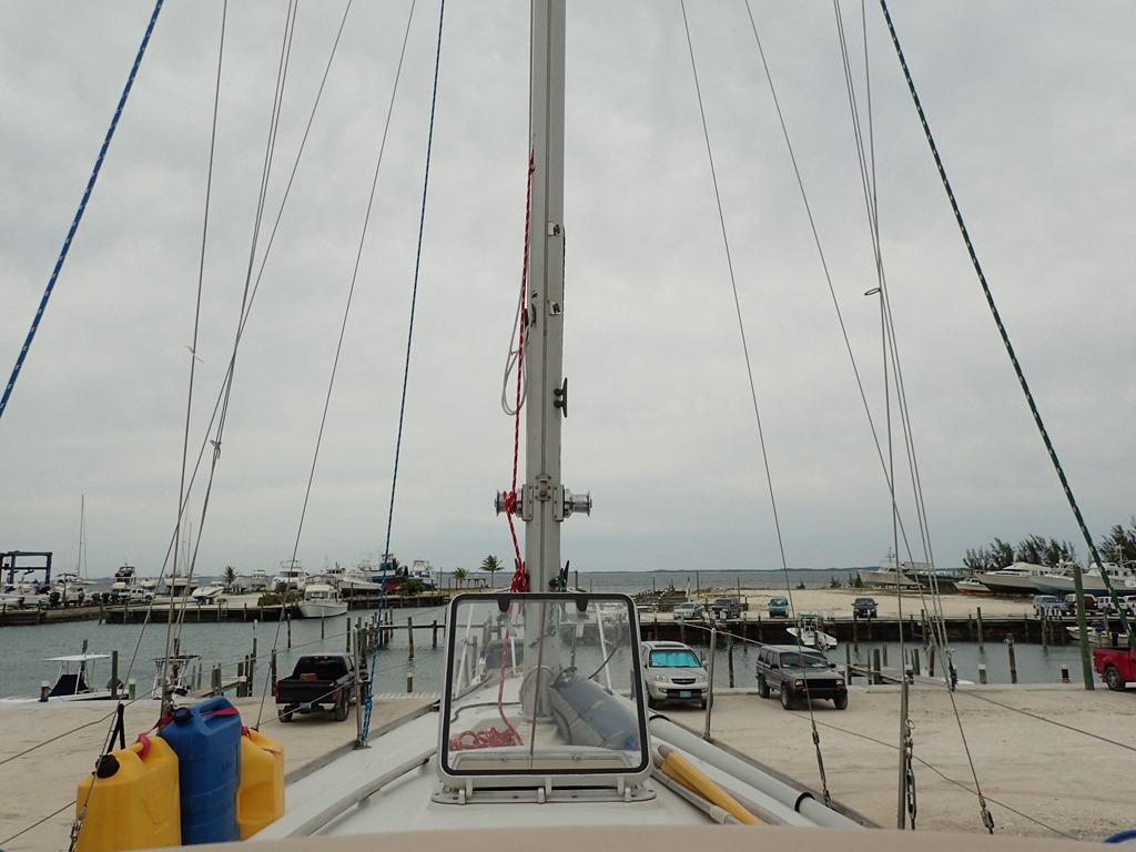 And we were once again climbing up a ladder to get on the boat. Here is the view from up there, looking across the Boat Yard’s basin and out to the Sea of Abaco.