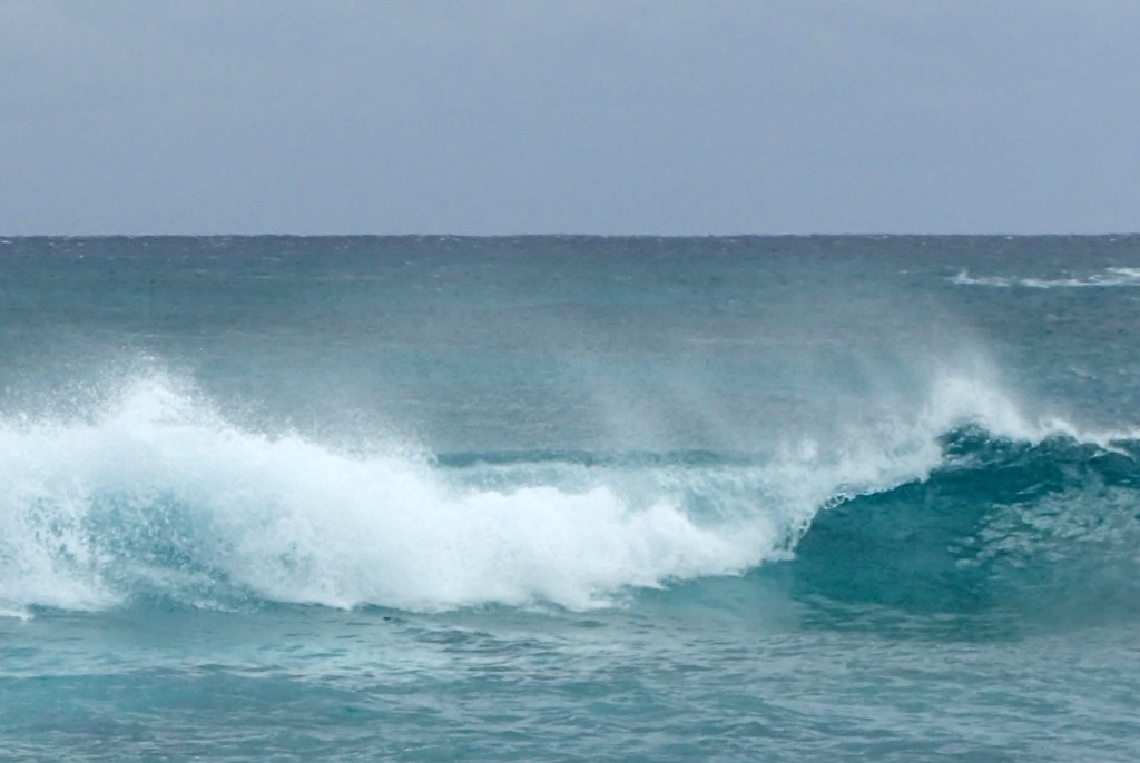 This is a small wave close to the beach – note the spindrift on its top: what the wind blows off the wave as it breaks.