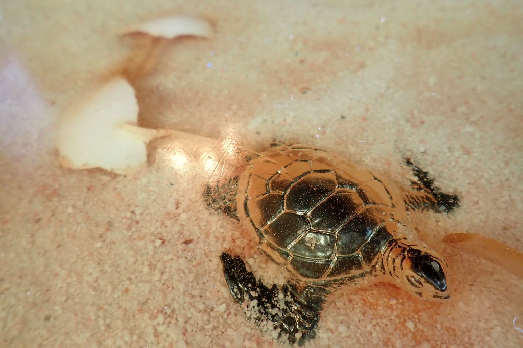 Our favorite beach bar, On da Beach, has a bar top that has always fascinated me. It’s a long expanse of clear resin. Embedded in the resin are baby turtles, just hatched from their shells.