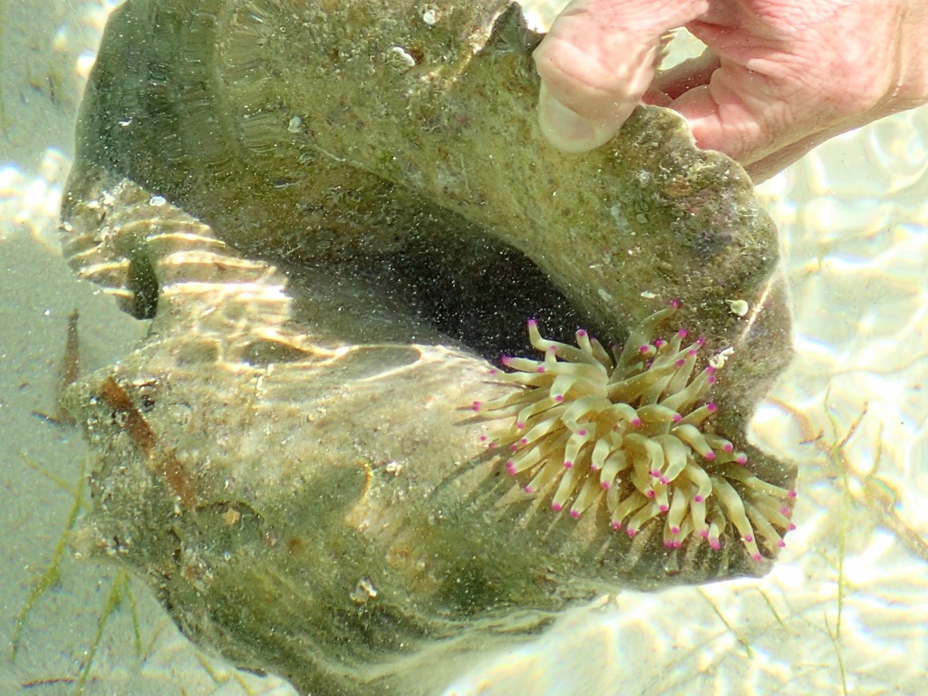 Then another bouncy, splashy ride – we were completely soaked – to Tahiti Beach at low tide. Where we found a whelk.