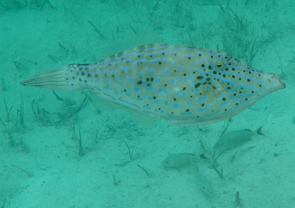 This is called a scrawled filefish. Almost translucent.