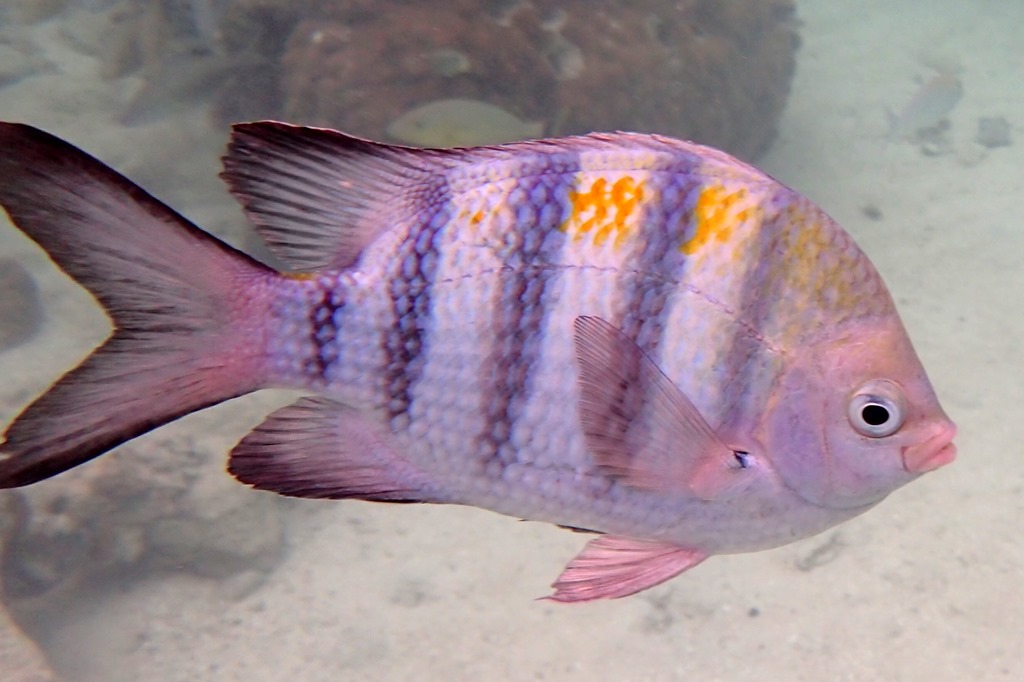 With lots of beautiful fish. Here are my best efforts at identifying them: a sergeant major.