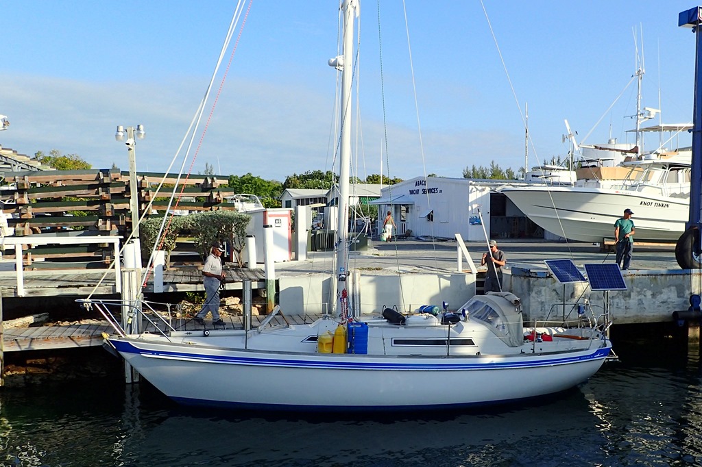 We’d spent the prior day tied to AYS’s dock so we could remove and fold the sails. All bagged now and ready to be stowed. Here she is “sail-less.”