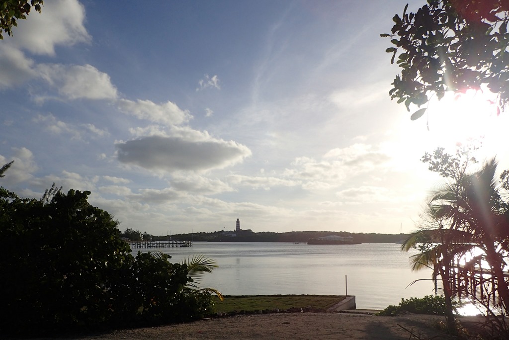 We walk back on the road, on the Sea of Abaco side. It’s almost twilight, the sun low behind the lighthouse.