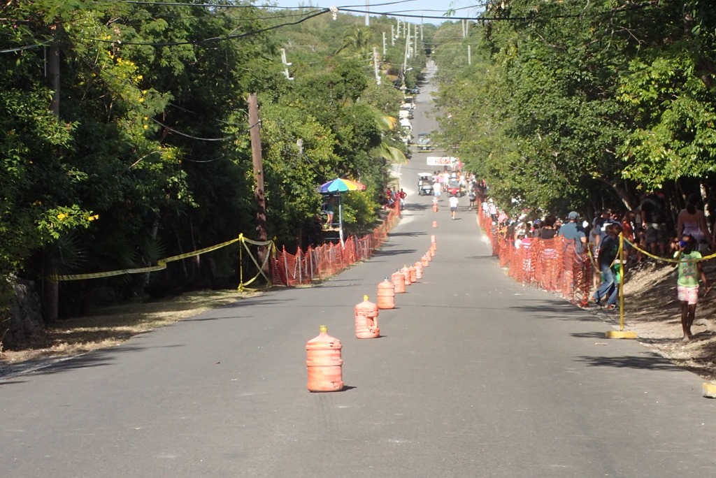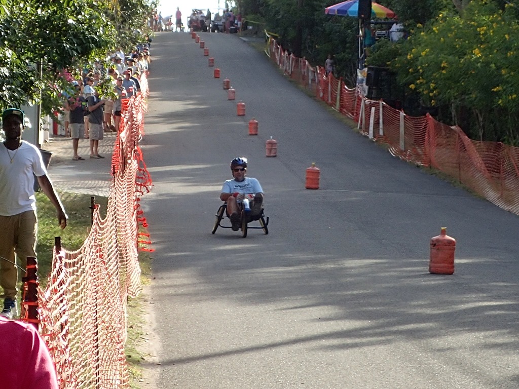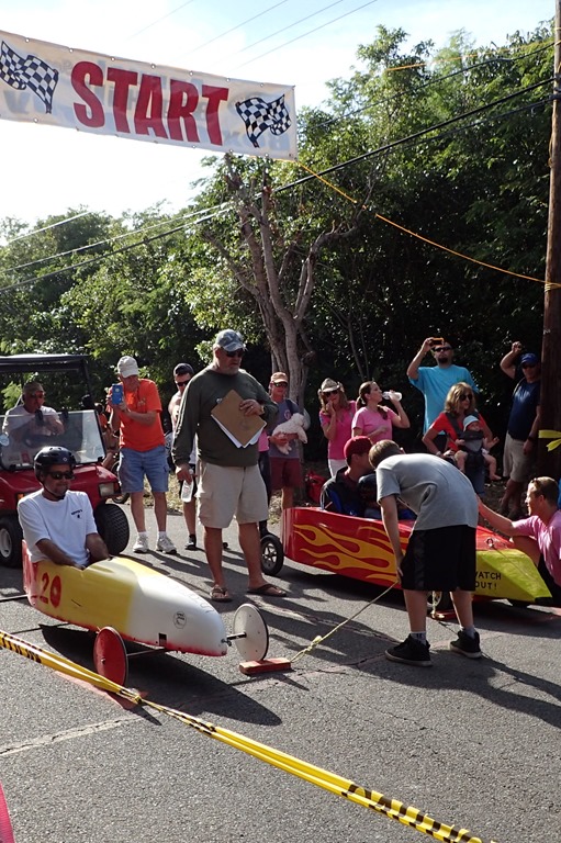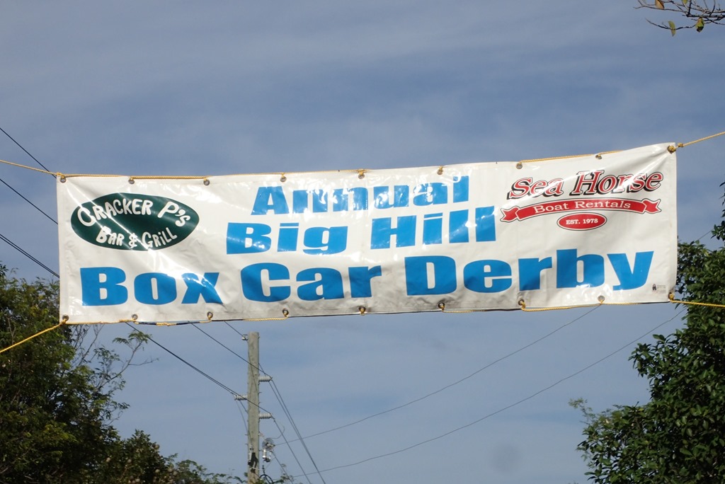 It’s Derby Day in the Abacos – the 18th annual box car races. Just south of HopeTown, the main road is blocked off for the day so homemade derby cars can race down the hill. We hitch-hiked there and back to enjoy the festivities.