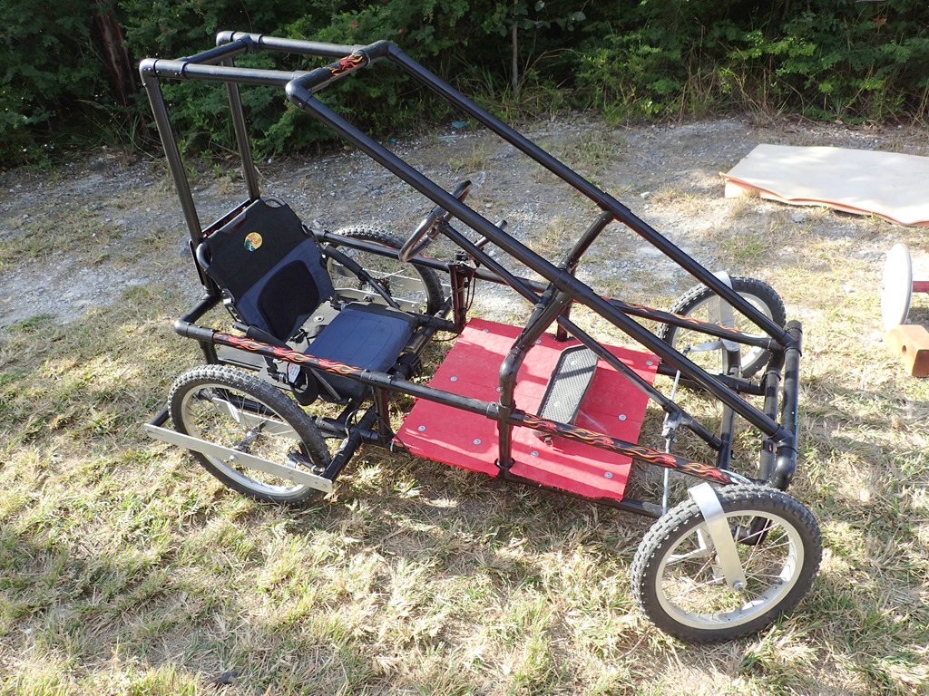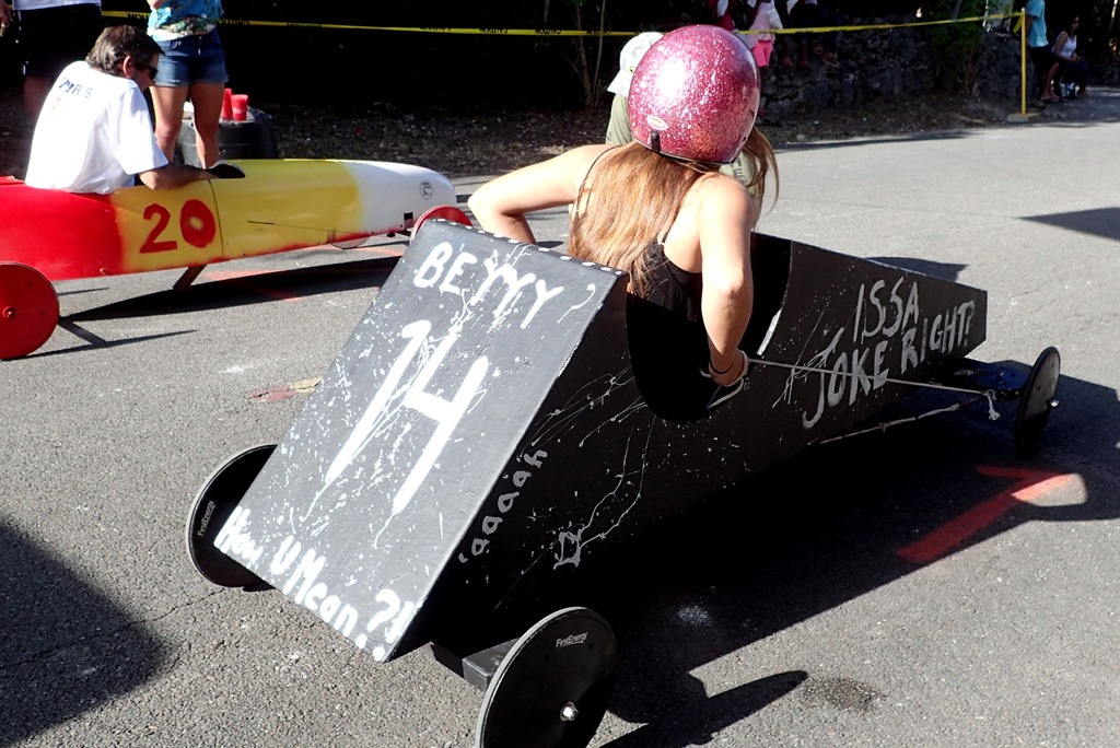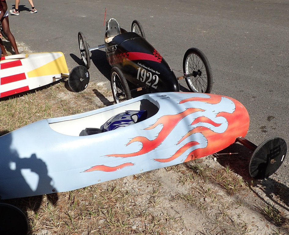 The blocks, connected by a rope, are pulled out by the starter after the 3-2-1 countdown and air horn “gun.” Racers pump themselves back and forth to encourage speed off the starting line. As they cruise down the hill, the cars reach almost 25 mph.