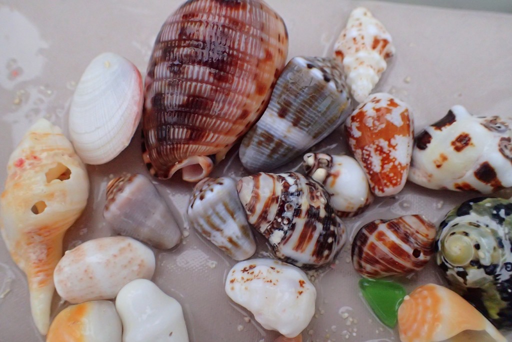 We hitch-hike back to the settlement – to admire our treasures.  Some shells: