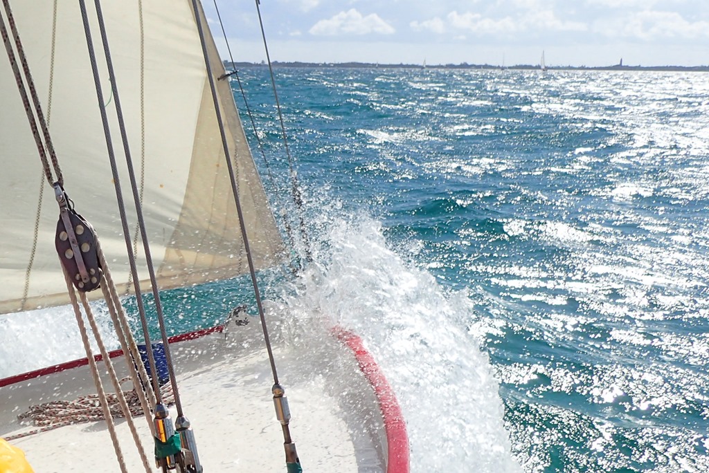 With a double reef.  Rarely does Rage sail with a double reef, but the winds were now 20 knots and gusting higher.  Spray over the bow.  Lots of water.