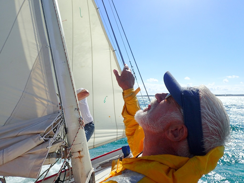 Take off the sail cover, hank on the jib, tie on the jib sheets, and load the beer.  With strong winds from the SW, we sailed out of the harbor on the jib.  Once we reached the Parrots, we raised the mainsail.