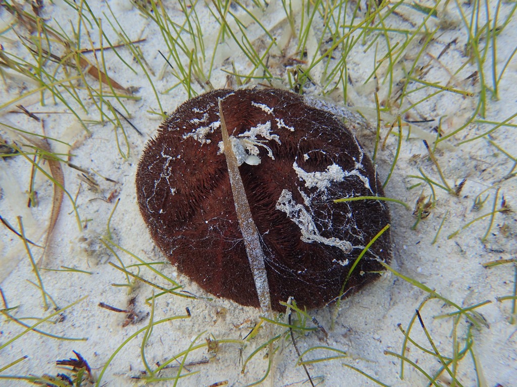 Closely related to sea urchins and sand dollars, sea stars are only found in salt water and can regenerate lost limbs. Here’s a sea urchin shell.