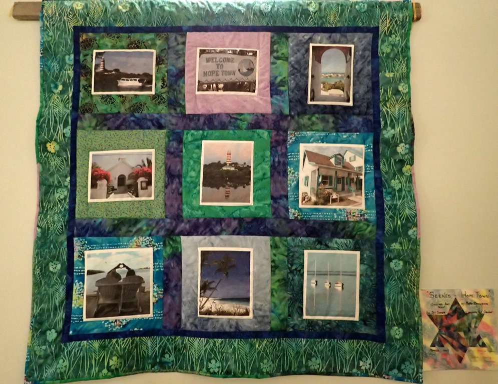Hope Town’s new Community Center opened earlier this year. It’s a beautiful venue for theater, music, lectures, and other events. And it’s a hurricane shelter, with huge thick walls. Quilters were solicited to craft wall hangings to decorate its huge walls. My friend Betty answered the call – with my photos. Here’s Betty and her quilt.