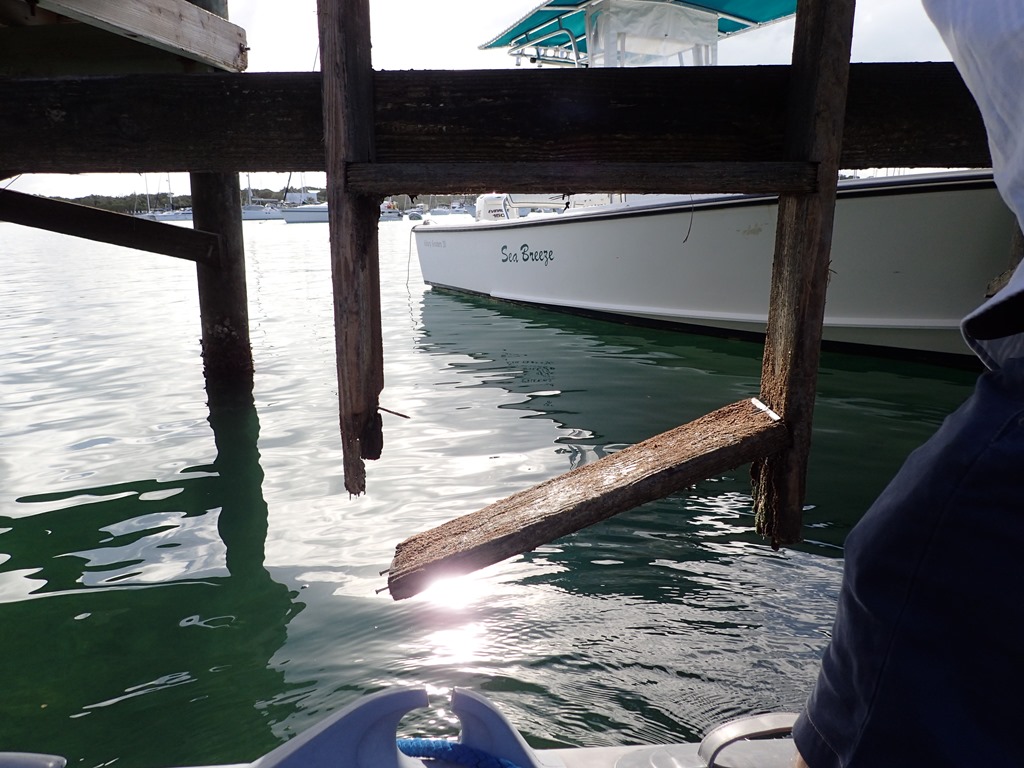 A combination of wind and current pinned the dinghy underneath the dock – the tide was rising, so it might have been hard to get it out.   Once they had to take boards off the dock to remove a dinghy – it had a pole sticking up through a gap in the dock.