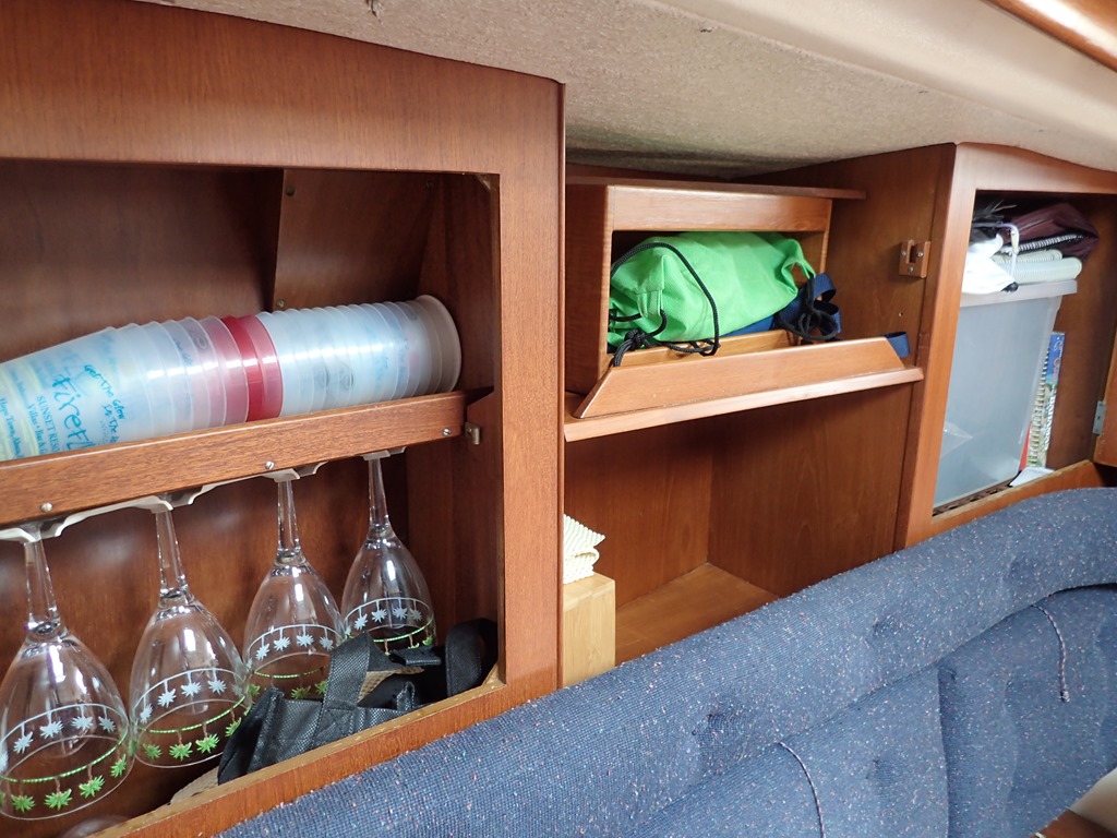 Outside, she is all buttoned up:  all the canvas has been removed, the mast tied on deck, and the dinghy put away.