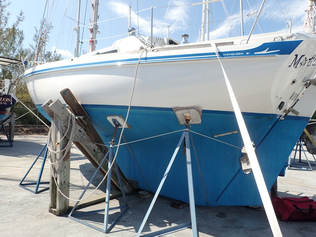 She is well-secured at Abaco Yacht Services in Green Turtle Cay.