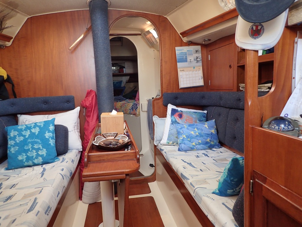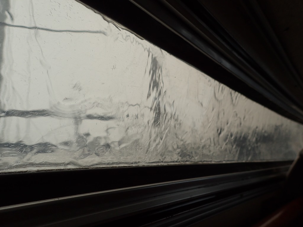 Motu Iti was in great condition – all that cleaning in the spring paid off!   But launch day was slightly delayed due to heavy rain and squalls.  Here was the view from inside our boat.  We left the rental after three nights and spent the next two nights up on the hard,  climbing a ladder to get aboard.