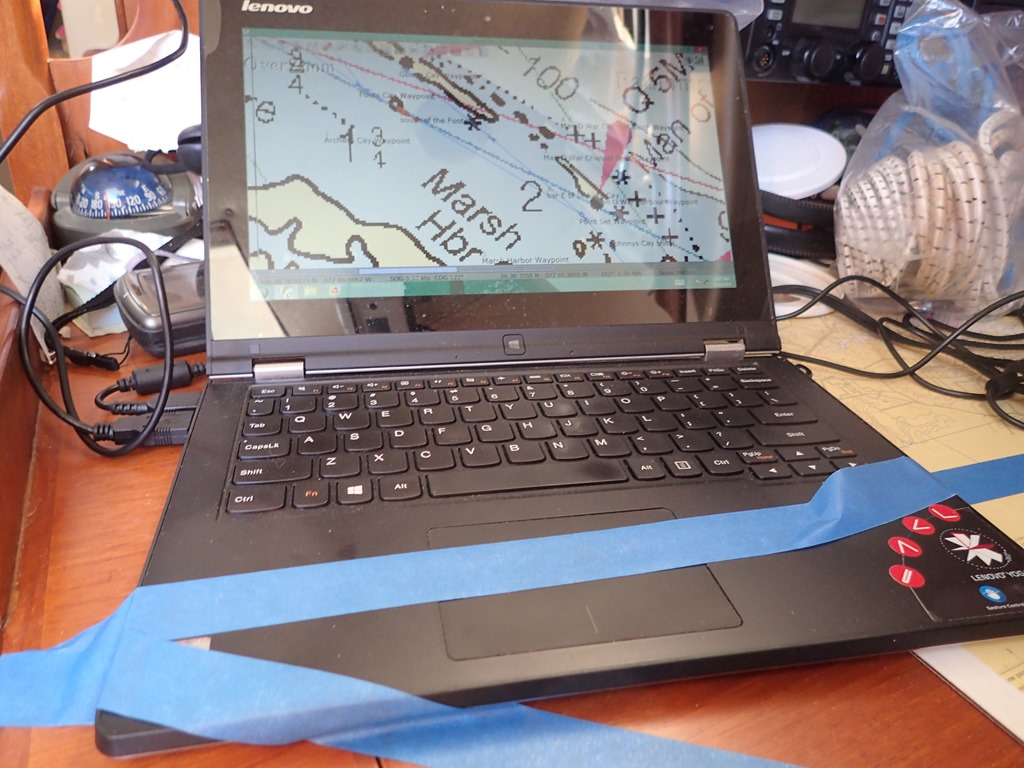 Note that I tape the computer to the navigation table so it doesn’t land on the floor when a big wave rolls us.  Here is a close up: