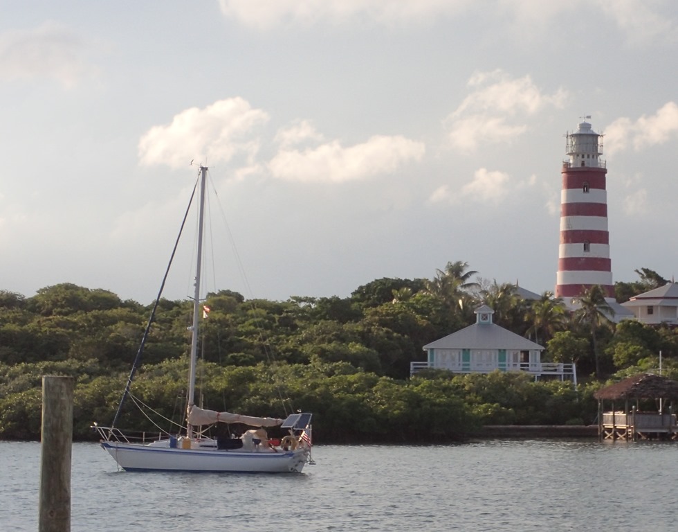 Prior to our passage, we input the latitude and longitude for a series of waypoints (specific locations we travel to and then make a course correction) that will take us around shallow spots, coralheads, and islands, and lead us to our destination.   But once we clear the shallows of Foots Cay, we just point the boat at the Elbow Cay lighthouse in Hope Town and in a few hours, we’re at the harbor entrance.