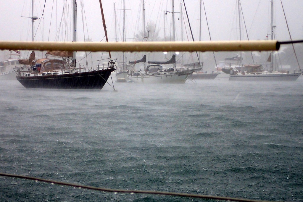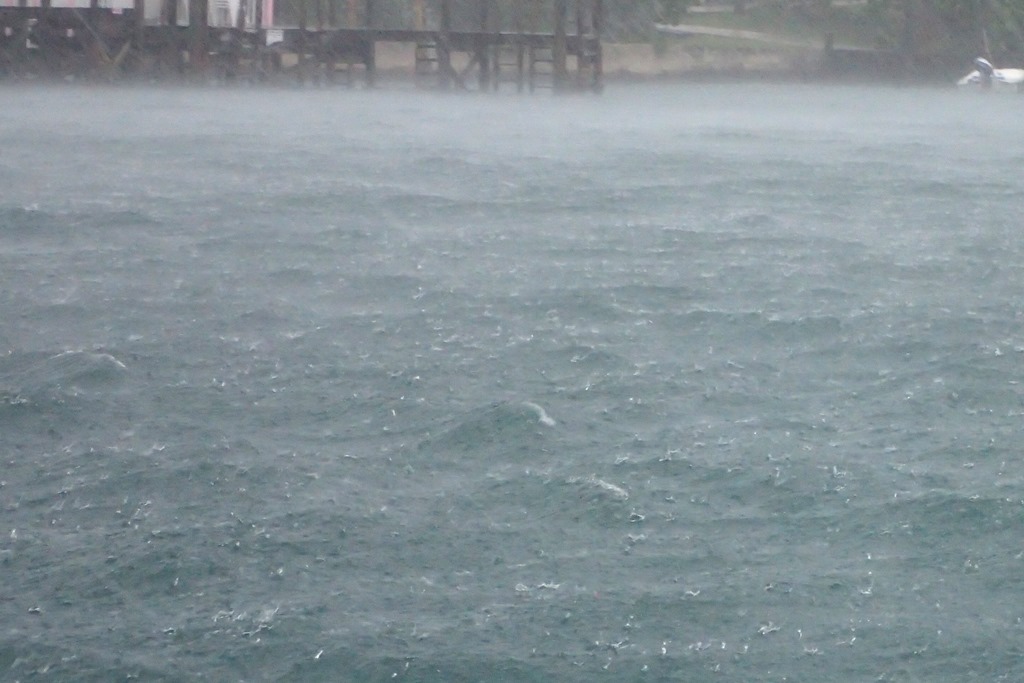 Rain sweeping sideways – big, pelting drops.   The wind’s fierceness whipping the water into a spume-like fog.  Whitecaps in the harbor.