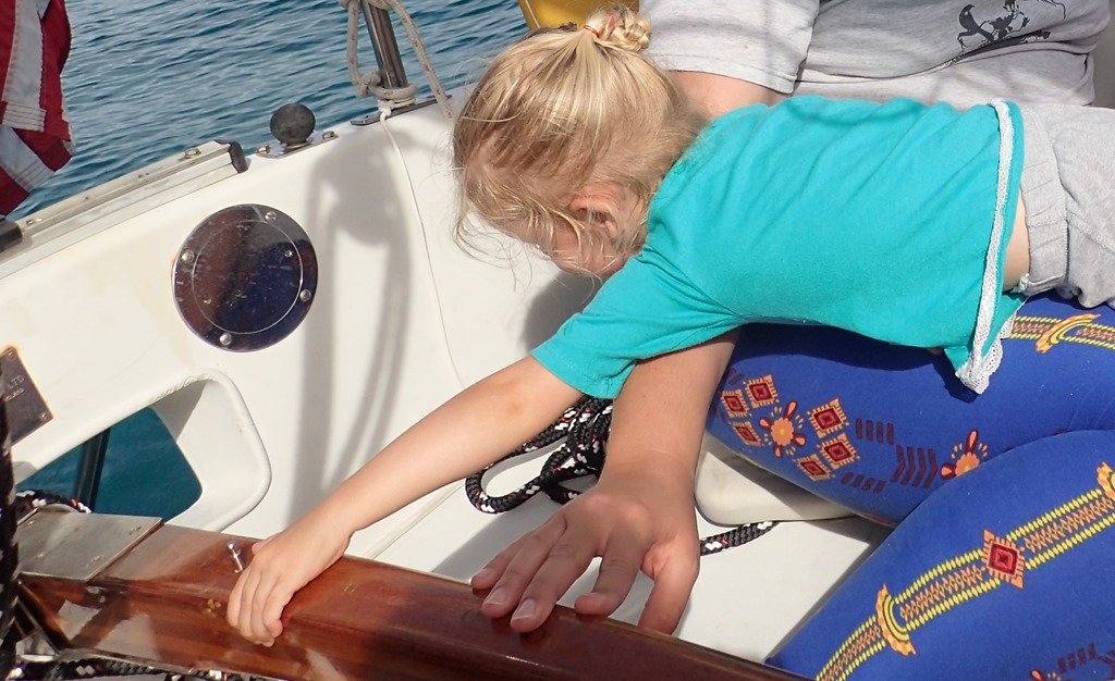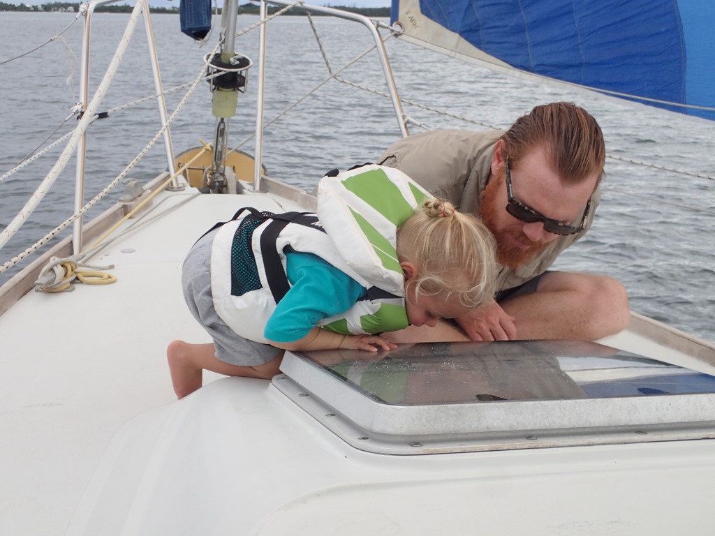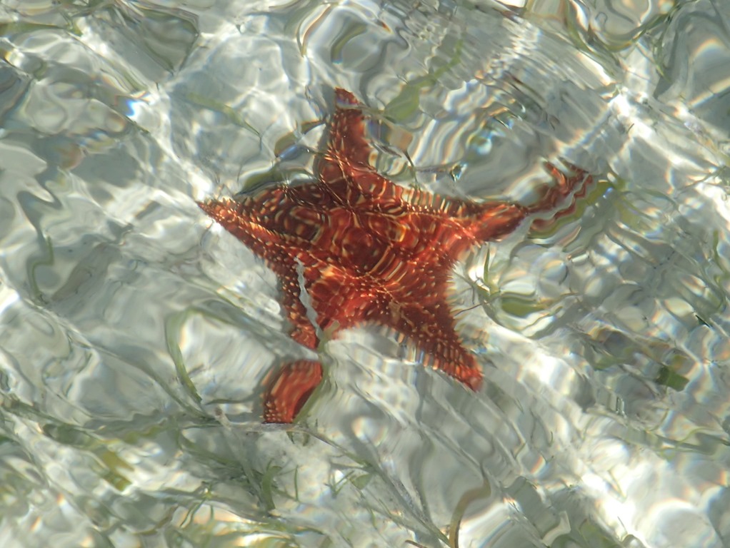Ghosting along so slowly in light air that we can find sea stars on the sandy bottom.