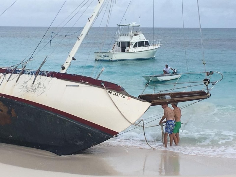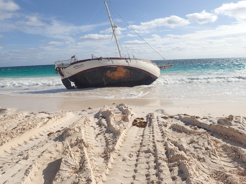 P.S. Update on the BOLO boat beached on Elbow Cay, oceanside: After she was stripped, efforts were undertaken to drag the hull out to sea and sink it. First she was pushed down the beach and rolled over, bow out.