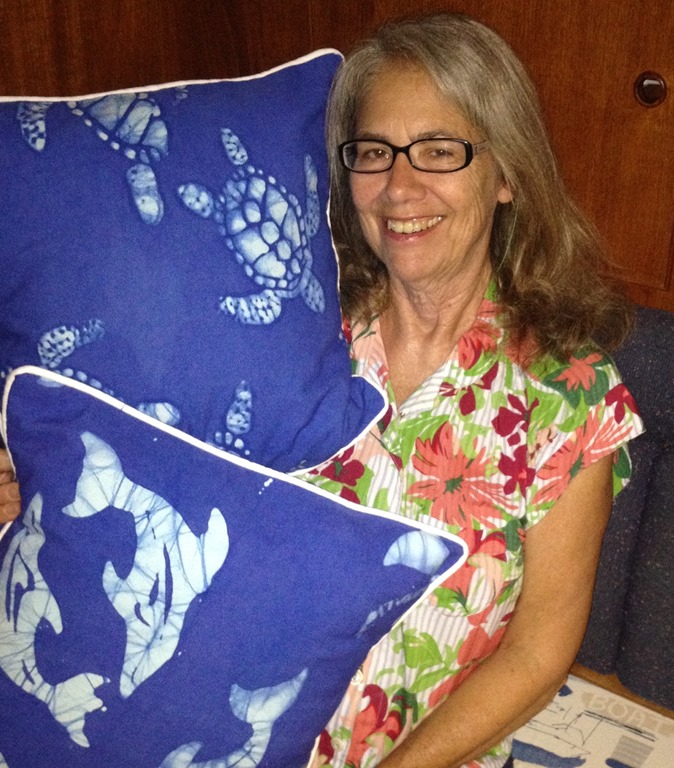 MOW has a great grocery store, good-sized hardware store, and decent ship’s chandlery. Plus: Joe’s Studio (gift shop), the Sail Shop (canvas duffle bags sewn on the premises) and Sally’s Seaside Shop (fabric store) featuring Androsian fabric – brilliantly colored batiks hand-made on Andros Island, to our south. Here I am with two pillows, made of blue Androsian fabric, which I WON in Sally’s Christmas raffle and was finally able to pick up. Beautiful.